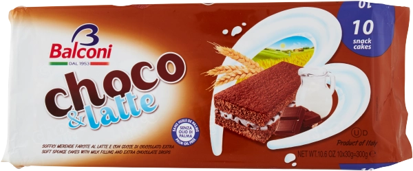 Skład: cukier, mąka pszenna (15%), jajka, tłuszcze roślinne (palmowy, słonecznikowy), czekolada (10,6%) (cukier, miazga kakaowa, tłuszcz kakaowy, emulgator: lecytyny sojowe, aromaty), syrop glukozowo-fruktozowy, odtworzone odtłuszczone mleko (10%), mleko odtworzone (4,7%), mleko odtłuszczone w proszku (1,5%), proszek kakaowy o obniżonej zawartości tłuszczu (0,9%), mleko w proszku, białka mleka, włókna pszenne, aromaty, emulgatory: mono-i diglicerydy kwasów tłuszczowych, lecytyny sojowe, środki spulchniające: węglany amonu, węglany sodu, difosforany, sól masa netto: 300g Wartości odżywcze w 100 g: Energia 1616 kj/ 386 kcal Tłuszcz 16 g w tym kwasy tłuszczowe nasycone 9,1 g Węglowodany 56 g w tym cukry 36 g Białko 5,5 g Sól 0,34 g Kraj pochodzenia: Włochy Sposób przechowywania: przechowywać w suchym i chłodnym miejscu, z dala od promieni słonecznych Data ważności: