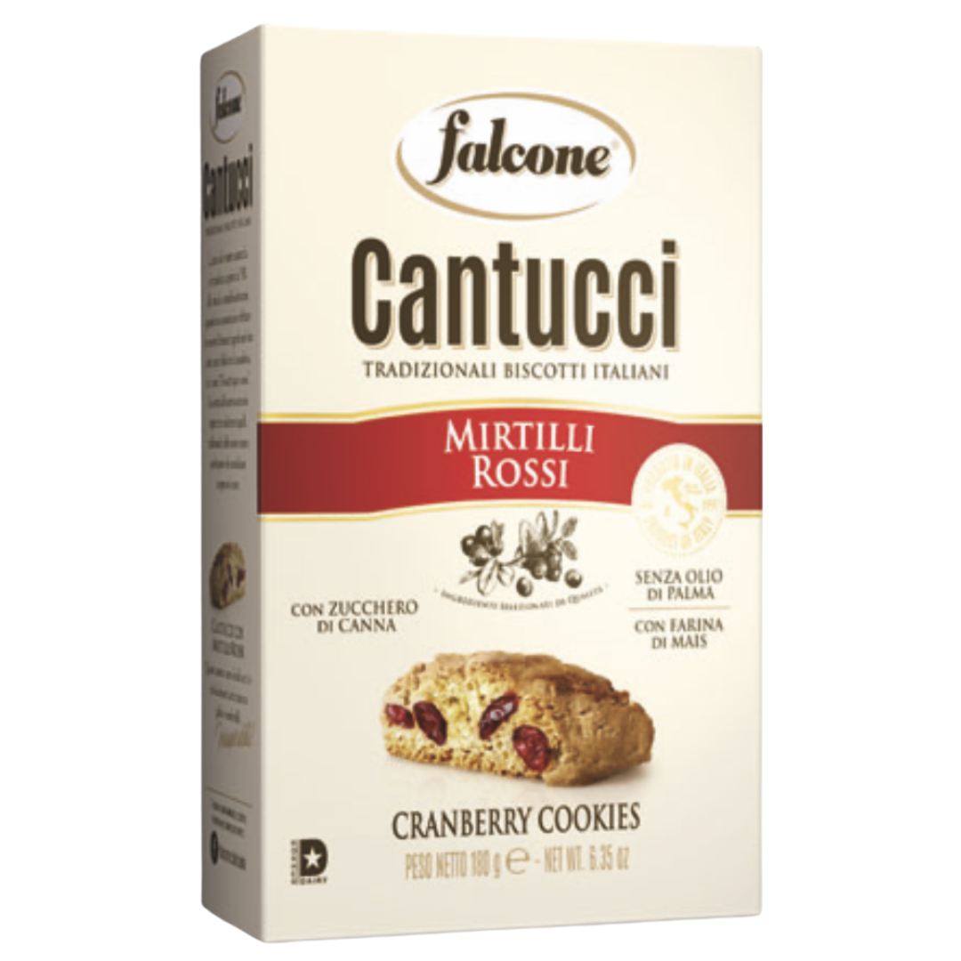 Cantucci Mirtilli Rossi od Falcone to tradycyjne, chrupiące włoskie ciasteczka z dodatkiem suszonej żurawiny. Klasyka w owocowej, lekko kwaskowej odsłonie.
