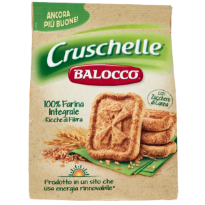 Herbatniki pełnoziarniste Cruschelle od Balocco to chrupiące, pełnoziarniste ciasteczka, które łączą naturalną mąkę pełnoziarnistą, cukier trzcinowy i dużą ilość błonnika.