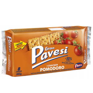 Krakersy Pomidorowe od Gran Pavesi to chrupiące przekąski o wyraźnym smaku pomidorów, które świetnie sprawdzają się między posiłkami.