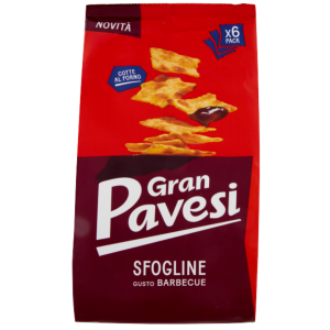 Krakersy Sfogline Barbecue od Gran Pavesi to cienkie, chrupiące krakersy o wyrazistym smaku barbecue, idealne dla miłośników lekko pikantnych przekąsek.