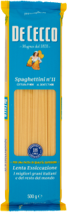 Spaghetti n.11 De Cecco to wyśmienita, tradycyjna włoska pasta, wytwarzana z wysokiej jakości semoliny pszennej i wody. Spaghetti to jedna z najbardziej popularnych i uwielbianych na całym świecie makaronów, charakteryzująca się smukłą i długą, nitkowatą formą.