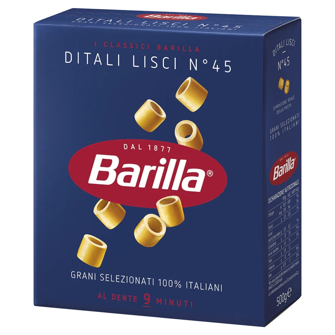Barilla od ponad 140 lat jest symbolem jakości i autentyczności. Makaron Ditali Lisci n°45 produkowany jest z najlepszej semoliny z pszenicy durum, co zapewnia mu idealną sprężystość oraz doskonałe właściwości podczas gotowania. Dzięki precyzyjnej technologii suszenia, makaron zachowuje odpowiednią twardość al dente oraz pełnię smaku, będąc perfekcyjną bazą zarówno dla lekkich, jak i bardziej wyrazistych dań.