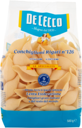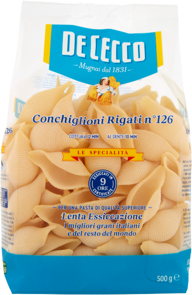 De Cecco Conchiglioni Rigati Nr 126 to wysokiej jakości, tradycyjny włoski makaron w kształcie dużych muszli. Jest on wykonany z najlepszej jakości semoliny z pszenicy durum, co daje mu wyjątkową trwałość i sprężystość po ugotowaniu. Conchiglioni Rigati doskonale nadają się do przygotowania różnego rodzaju dań, zarówno z mięsem, jak i z warzywami czy serem. Ich duże rozmiary umożliwiają wypełnienie ich różnymi farszami, co pozwala na stworzenie niezwykle smacznych i kreatywnych potraw. Makaron De Cecco to gwarancja najlepszej jakości i smaku, dlatego też cieszy się on ogromnym uznaniem wśród konsumentów na całym świecie.