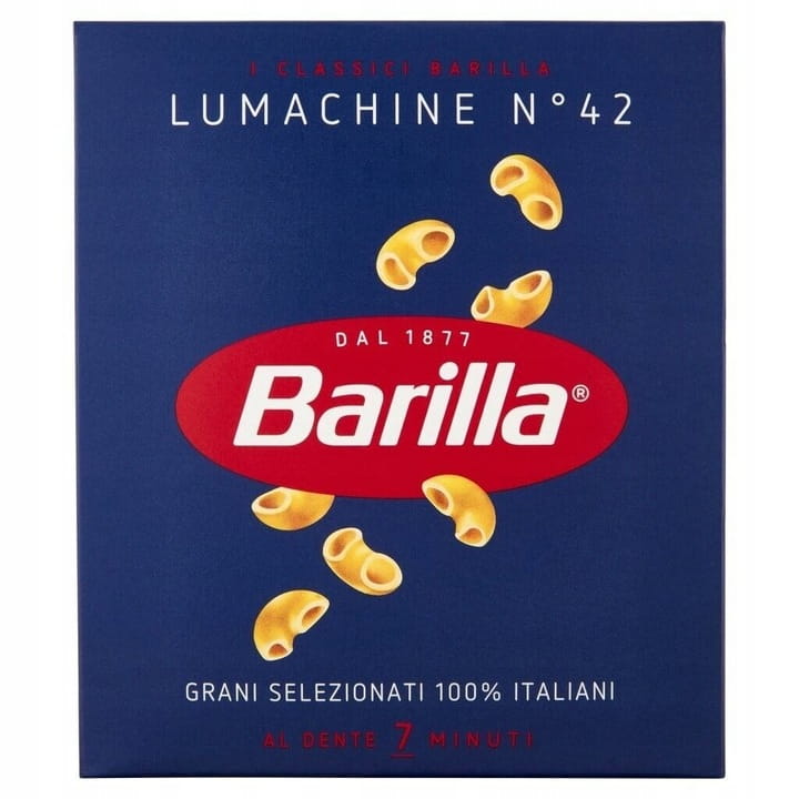 Makaron Lumachine n°42 od Barilli to drobne, zakrzywione rurki przypominające małe muszelki. Ten uroczy i praktyczny kształt sprawia, że makaron świetnie zatrzymuje sosy i dodatki wewnątrz, dzięki czemu każdy kęs jest pełen smaku. Klasyka włoskiej kuchni w kompaktowej formie — idealna na szybkie i aromatyczne dania.