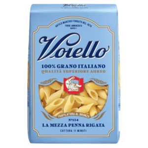 Makaron Mezze Penne Rigate od Voiello to skrócona wersja znanych penne, z ukośnie ściętymi końcówkami i wyraźnymi rowkami na całej powierzchni. Dzięki mniejszemu rozmiarowi i rowkowaniu ten makaron świetnie łapie sos i doskonale sprawdza się w szybkich, codziennych daniach — bez kompromisów w smaku i teksturze.