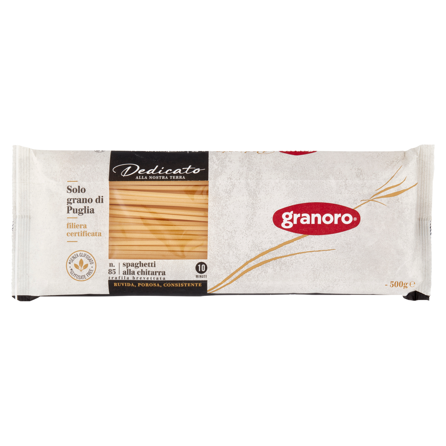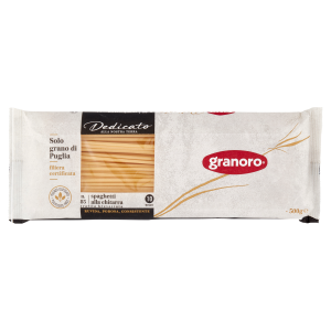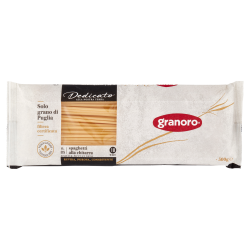 Skład: Semolina z pszenicy durum, może zawierać śladowe ilości soi i gorczycy Masa netto: 500g Wartości odżywcze w 100g: Energia 1507kj/ 355kcal Tłuszcz 1,5g w tym kwasy tłuszczowe nasycone 0,5g Węglowodany 71g w tym cukry 3g Błonnik 3g Białko 13g Sól 0g Kraj pochodzenia: Włochy Sposób przechowywania: przechowywać w suchym i chłodnym miejscu, z dala od promieni słonecznych Data ważności: