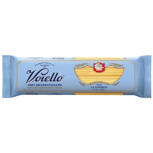 Makaron ma sprężystą, zwartą strukturę i po ugotowaniu trzyma się świetnie widelca – nie rozmięka, nie skleja się. Delikatnie spłaszczony kształt sprawia, że sos równomiernie pokrywa każdą nitkę. Linguine od Voiello jest wyciskane przez matryce z brązu, co daje lekko szorstką powierzchnię – a to duży plus, jeśli zależy Ci na tym, by smak trzymał się makaronu, a nie spływał po nim.