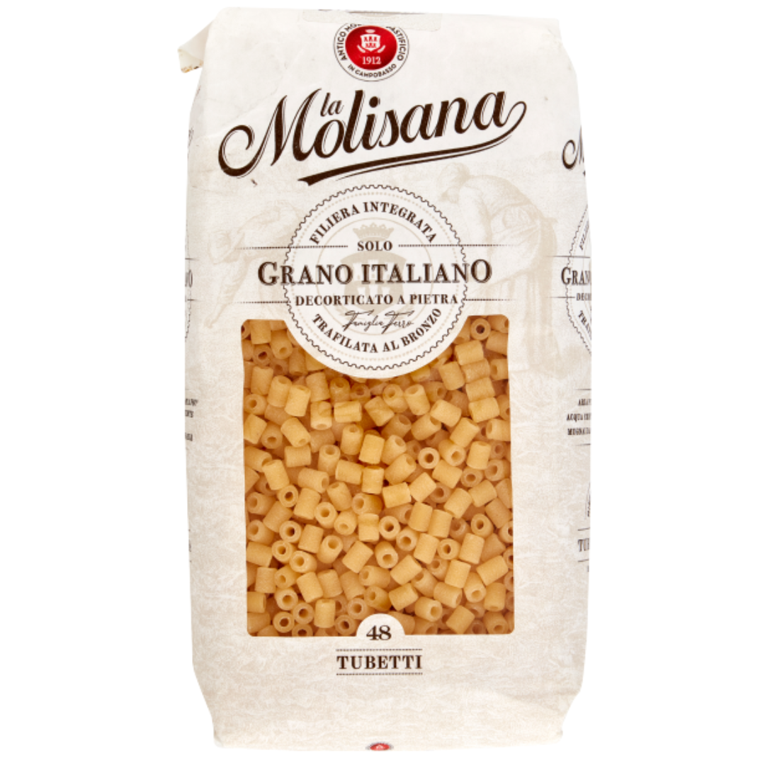 Tubetti to krótki, rurkowaty makaron, który świetnie sprawdza się w zupach i daniach jednogarnkowych. Format drobny, ale nie całkiem mikro – wystarczająco duży, by coś wnosić do dania, ale na tyle mały, by nie dominować. La Molisana proponuje tu klasyczne wykonanie z pszenicy durum, które dobrze trzyma się formy po ugotowaniu.