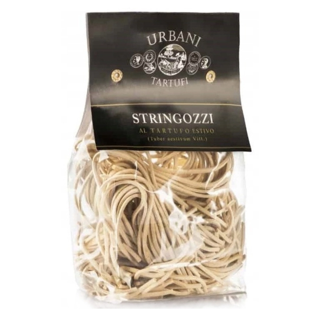 Stringozzi to makaron o lekko nieregularnym, grubym kształcie przypominającym ręcznie formowane sznurki. W tej wersji wzbogacony został dodatkiem prawdziwych trufli, co daje efekt intensywnego, ziemistego aromatu już podczas gotowania. Urbani, znany z produktów truflowych, proponuje tu pastę, która sama w sobie stanowi gotowe danie.