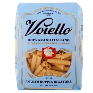 Ziti Dippia Rigat to klasyczny południowowłoski makaron w formie długich, szerokich rurek z podwójnym rowkowaniem. Format wyrazisty, stworzony do konkretnych, gęstych sosów. W wersji od Voiello mamy do czynienia z pastą o charakterze, która po ugotowaniu nie znika w daniu – wręcz przeciwnie, gra pierwsze skrzypce.