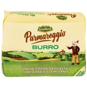 Skład; Masło Parmareggio jest produkowane ze śmietanki pochodzącej z serowarni regionu Emilia Masa netto: 200g Wartości odżywcze w 100g: Energia 3096kj/ 753kcal Tłuszcz 83g w tym kwasy tłuszczowe nasycone 57g Węglowodany 0.6g w tym cukry 0.6g Błonnik 0g Białko 0.02g Sól 0g Kraj pochodzenia: Włochy Sposób przechowywania: przechowywać w suchym i chłodnym miejscu, z dala od promieni słonecznych Data ważności: