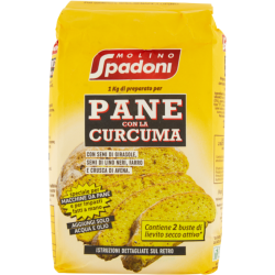 Składniki: mąka pszenna miękka – typ „1”, mąka orkiszowa (5%), siemię lniane (5%), nasiona słonecznika (5%), mąka PSZENNA miękka – typ „0” zakwas suszony, otręby owsiane (2%), gluten pszenny, sól jodowana, kurkuma w proszku (0,8%), cukier trzcinowy, przeciwutleniacz: kwas askorbinowy; enzymy. Opakowanie zawiera 2 saszetki aktywnych drożdży suszonych w atmosferze ochronnej (znanych jako drożdże piwowarskie): drożdże suszone (Saccharomyces cerevisiae), emulgator: monostearynian sorbitanu (E491). Może zawierać soję, mleko, gorczycę, sezam i łubin. Wartość odżywcza w 100g: Wartość energetyczna 1526kJ/361kcal Tłuszcz 5,6g w tym kwasy tłuszczowe nasycone 0,5g Węglowodany 59g w tym cukry 1,7g Białko 16g Sól 1,6g Masa netto: 1000g Kraj pochodzenia: Włochy Sposób przechowywania: przechowywać w suchym i chłodnym miejscu z dala od promieni słonecznych Data ważności: