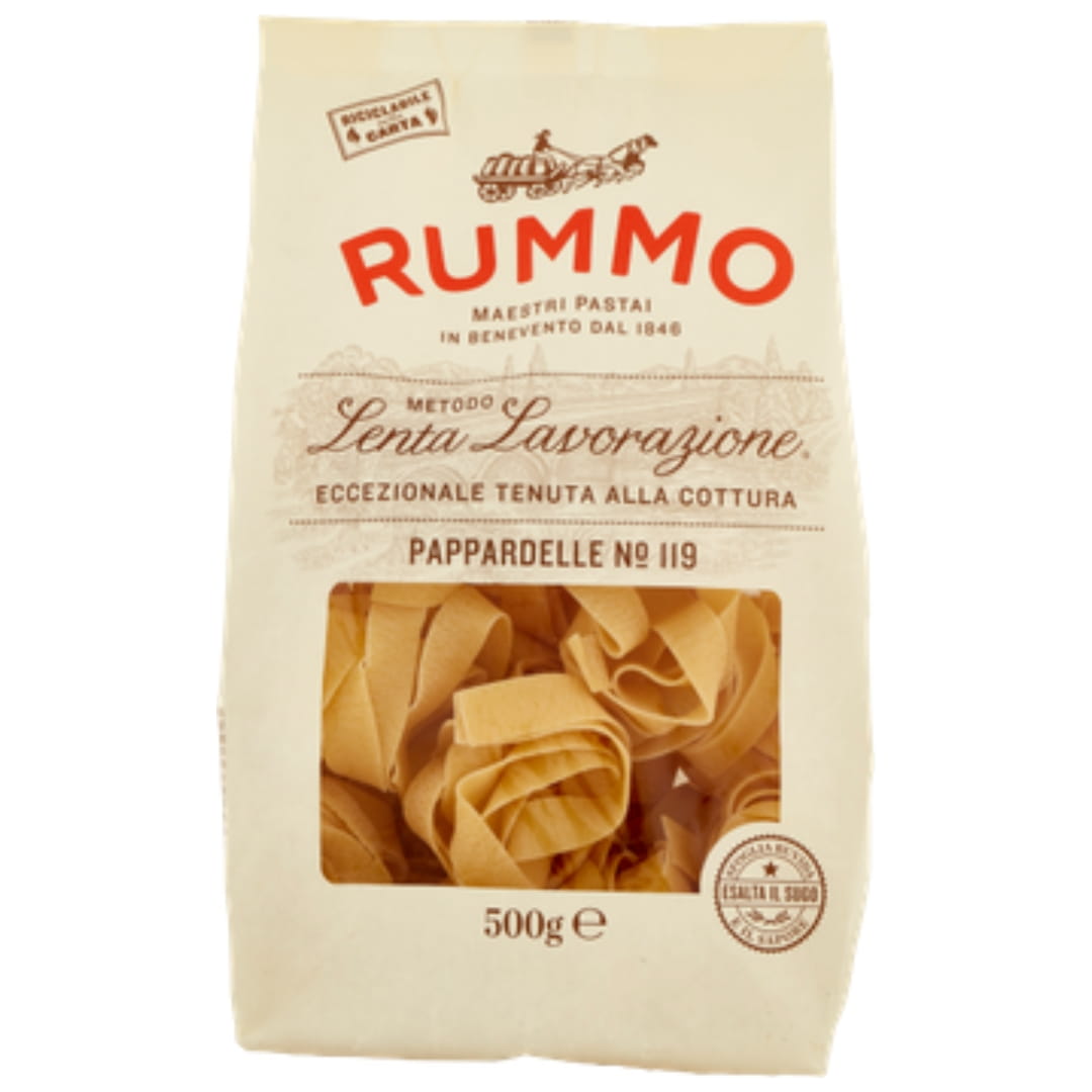 To klasyczne, szerokie wstążki – grube, sprężyste i z wyraźną strukturą. Po ugotowaniu nie tracą kształtu, nie sklejają się i mają przyjemny „ząb” – dokładnie taki, jakiego się szuka w porządnym makaronie z semoliny. Dzięki szorstkiej powierzchni pappardelle świetnie łapią sos – nie tylko ślizgają się po nim, ale dosłownie go wchłaniają.