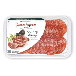To dojrzewająca, włoska kiełbasa wieprzowa wzbogacona naturalnym aromatem trufli – elegancka, intensywna, ale doskonale wyważona. Gianni Negrini łączy tu klasyczne rzemiosło wędliniarskie z wykwintnym składnikiem, jakim jest czarna trufla.