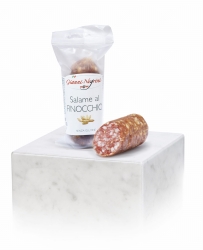 Salami Salame al Finocchio 125g marki Gianni Negrini to wykwintny włoski przysmak, który zadowoli podniebienia miłośników najwyższej jakości wędlin. Ten wyjątkowy salami charakteryzuje się delikatnym smakiem biorącym swoją unikalność z dodatku nasion kopru włoskiego, które nadają mu subtelnej, lekko anyżowej nuty. Produkt ten jest tworzony według tradycyjnych receptur i produkowany z najlepszych kawałków mięsa wieprzowego, co gwarantuje jego wyjątkowy smak oraz teksturę.
