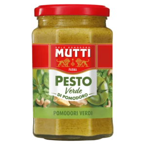 Marka Mutti znana jest na rynku od wielu lat. Jej produkty cieszą się dużą popularnością i są chętnie wybierane przez klientów. Dzieje się tak, ze względu na niesamowity smak produktów, ich najwyższą jakość oraz naturalny skład. Tak też jest w przypadku Pesto Verde di pomodoro. Przygotowane zostało na bazie przecieru z zielonych pomidorów, z dodatkiem oleju słonecznikowego, bazylii, sera Grana Padano i Pecorino Romano, nerkowców, czosnku, cukru i soli.